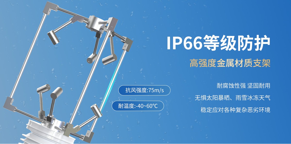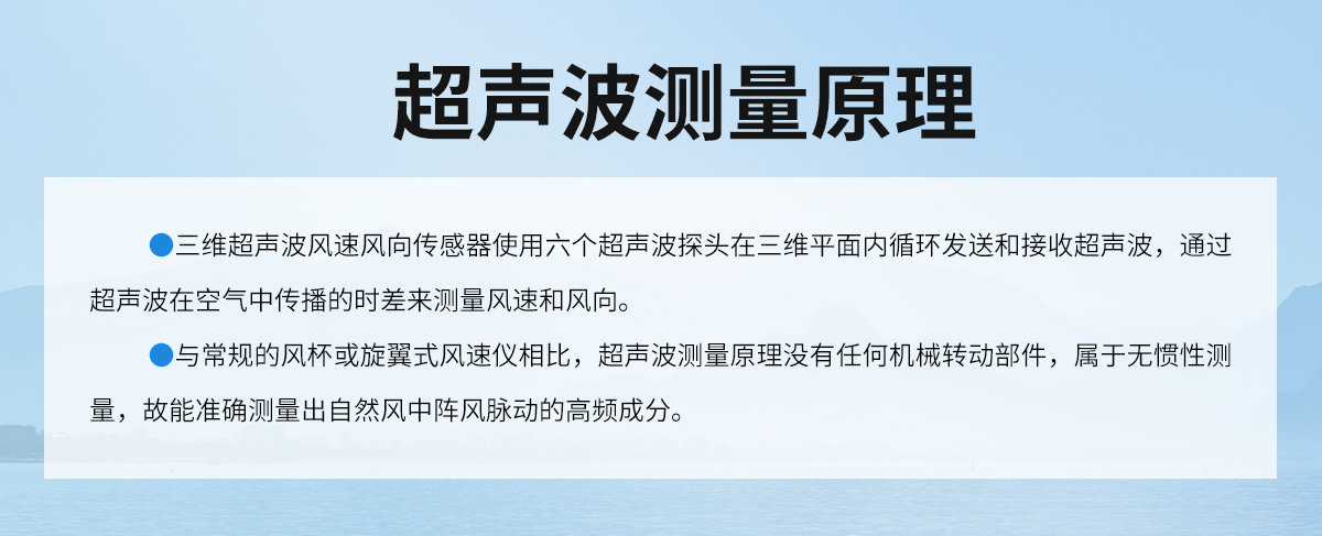 三维超声波风速风向传感器使用六个超声波探头在三维平面内循环发送和接收超声波,通过超声波在空气中传播的时差来测量风速和风向。可以同时测量风速,风向,声速和声温的瞬时数值。广泛适用于气象、海洋、环境、机场、港口、实验室、工农业及交通等领域。