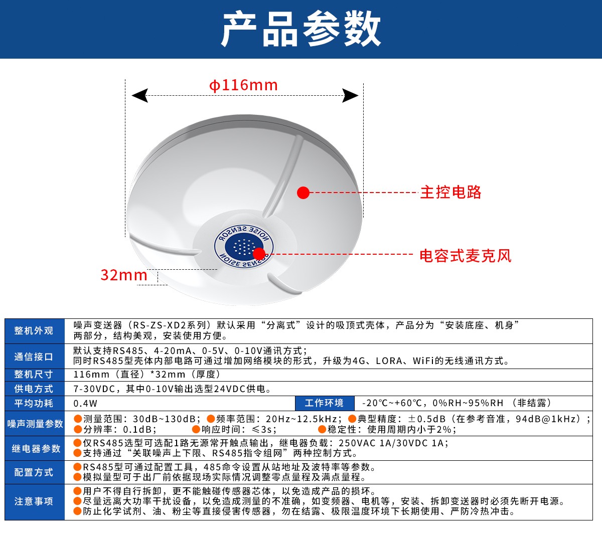 吸顶式噪声变送器是一款高精度的声音计量仪器,采用高灵敏度的电容式麦克风,量程高达30dB~130dB,满足日常测量需求,支持多种信号输出方式,信号稳定,精度高。具有测量范围宽、线形度好、安装方便等特点。广泛应用于家庭、办公、车间、汽车测量、工业测量等各种领域。